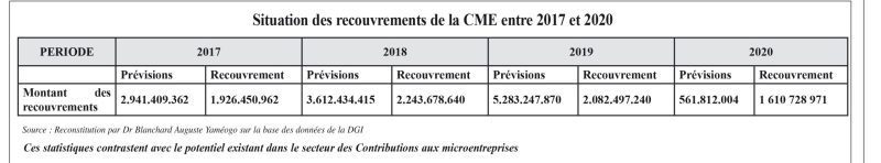 A la faveur de cette réforme, les entreprises relevant de la Contribution des microentreprises (CME) ont été réparties en deux sous-régimes, dont la CME-régime déclaratif (chiffre d’affaires annuel compris entre 5 et 15 millions FCFA) et la CME-régime forfaitaire concerne les personnes physiques dont le chiffre d’affaires annuel est inférieur à 5 millions FCFA.