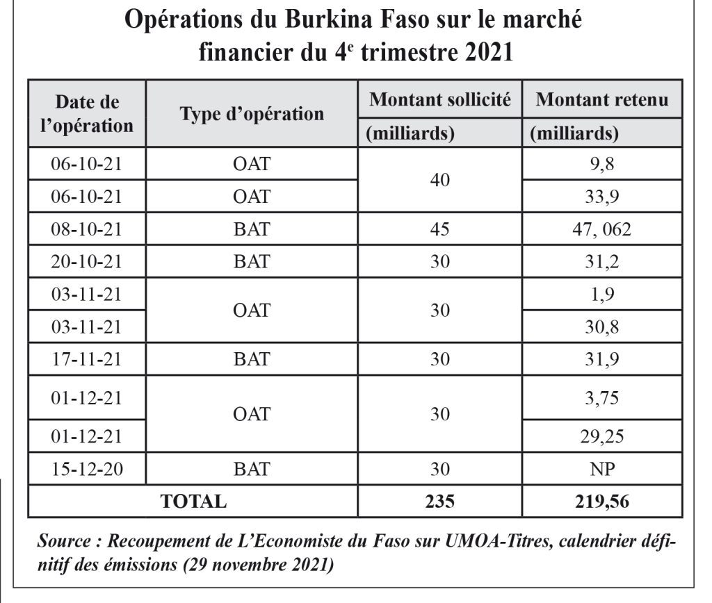 Depuis le début du dernier trimestre de l’année, le Burkina Faso a émis 9 titres publics. Selon le calendrier, il n’en resterait qu’une pour le mois de décembre pour boucler la série des émissions. Selon les recoupements faits par L’Economiste du Faso, les projections ne seront peut-être pas atteintes. Au 1er décembre 2021, le pays a levé 219,56 milliards sur le marché financier pour un montant total sollicité de 235 milliards FCFA. La dernière opération de l’année et du trimestre est prévue pour le 15 décembre prochain. Il s’agit d’un Bon de soutien et de relance de 30 milliards FCFA sur une durée d’une année.