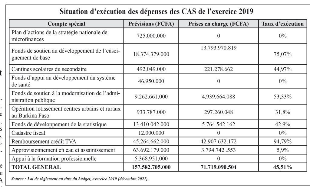 Mais le plus inquiétant est le faible taux d’exécution des budgets. Sur une prévision de 157,582 milliards FCFA en 2019, la somme de 71,719 milliards FCFA a été dépensée, soit un taux de 45,51%. Des CAS comme « Appui à la formation professionnelle », « Appui au développement du système de santé » et « Plan d’actions de la stratégie nationale de microfinances » affichent des taux d’exécution nuls, c’est-à-dire qu’aucune dépense n’a été effectuée sur ces comptes durant l’année.