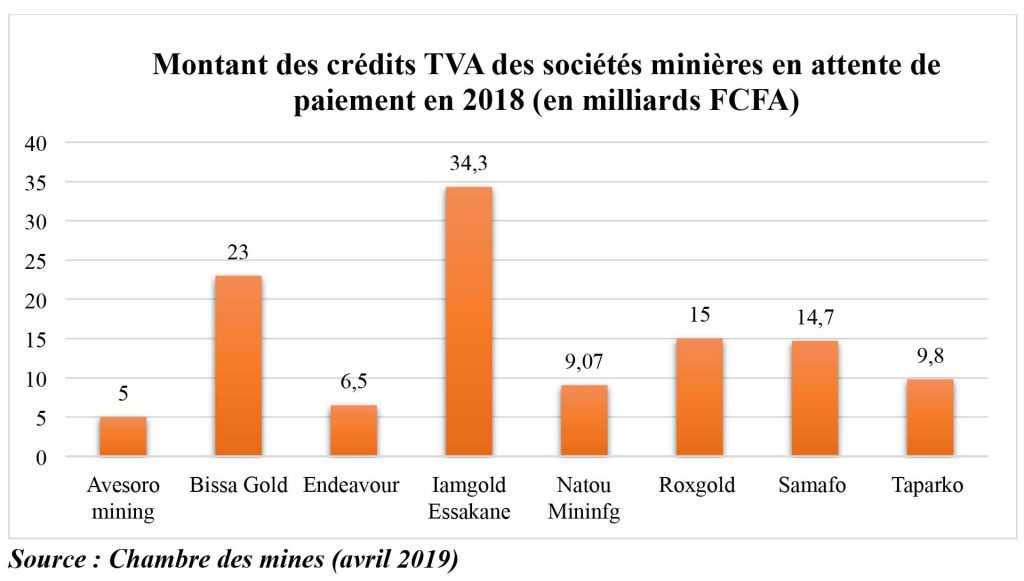 A titre d’exemple, au 30 septembre 2018, la Direction générale des Impôts (DGI) cumulait des instances de remboursement de crédits de la TVA de 84,909 milliards FCFA concernant 157 dossiers. La Direction des grandes entreprises détenait 73 dossiers, soit 46,5%, représentant un montant de 34,881 milliards FCFA. Dans ce lot, les crédits TVA du secteur minier étaient les plus importants. Dans une lettre en date du 11 avril 2019 et adressée au Premier ministre, la Chambre des mines du Burkina Faso (CMB) a évalué la dette globale de crédit TVA des sociétés minières à 48 milliards FCFA au 31 décembre 2018.