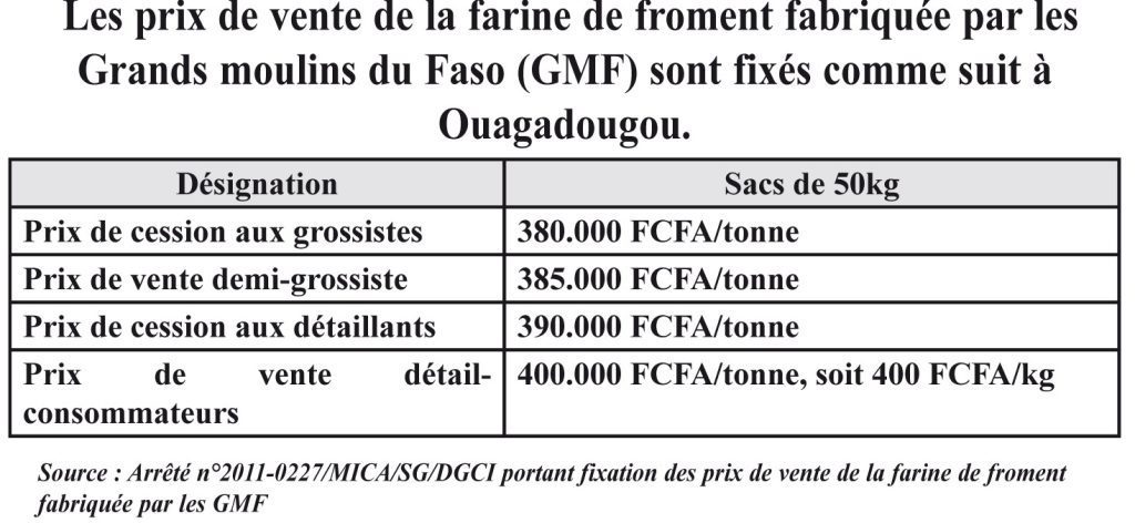 Les prix de vente de la farine de froment fabriquée par les Grands moulins du Faso (GMF) sont fixés comme suit à Ouagadougou.