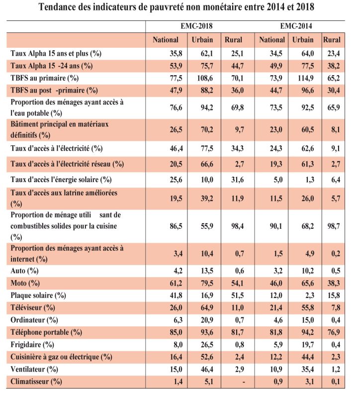 Les tendances des indicateurs non monétaires corroborent ce constat. L’amélioration des indicateurs non monétaires de la pauvreté concerne aussi bien le milieu urbain que le milieu rural. Au niveau des indicateurs de l’éducation, le taux d’alphabétisation des adultes est passé de 34,5% en 2014 à 35,8% en 2018, et celui des jeunes de 15-24 ans (indicateur ODD) est passé de 50% à 54% entre 2014 et 2018 (NDLR : voir tableau ci-contre).