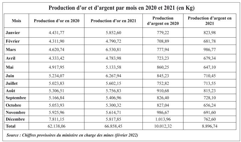 Quant à la production d’argent, elle a connu une baisse passant de 10.012 tonnes en 2020 à 8.896 tonnes en 2022, soit une baisse de 12,5%. En rappel, l’argent est une ressource qui est extraite de l’or produit. Il est extrait et vendu à part.