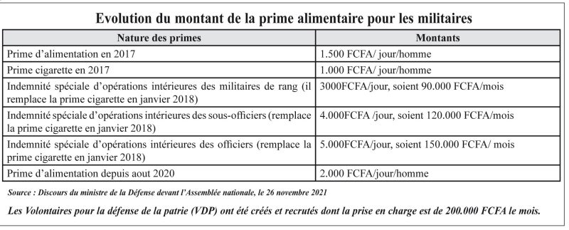 Mais à partir d’août 2020, la prime d’alimentation est passée à 2.000 FCFA par jour et par homme. En janvier 2018, l’IS-OPINT a remplacé la prime cigarette. Le montant de la prime a d’abord été fixé à 3.000 FCFA par jour et par homme pour le militaire du rang, 4.000FCFA pour le sous-officier et 5.000FCFA pour l’officier. Ce qui correspond à 90.000 FCFA, 120.000 FCFA et 150.000 FCFA par mois en fonction des catégories. A partir de septembre 2021, les taux ont été augmentés de 1.000 FCFA pour chaque catégorie pour se situer respectivement à 4.000, 5.000 et 6.000 FCFA par jour et par homme.