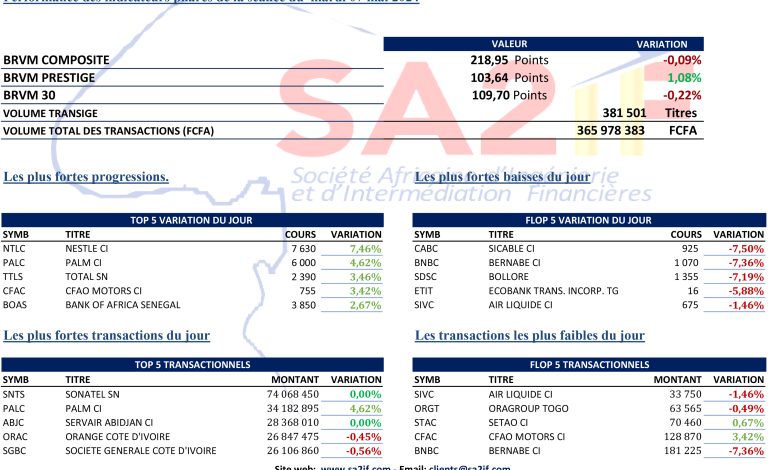 Le TOP 3 de la journée, quant à lui, est composé des sociétés Nestlé CI (+7,46%), suivie par Palmci (+4,62%) et Total SN (+3,46%) après une chute drastique de leur cours lors de la séance précédente.