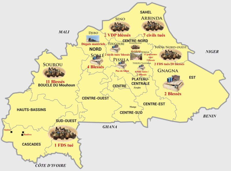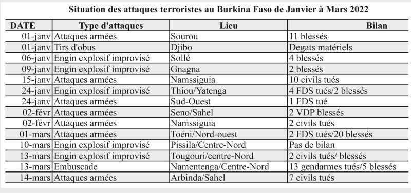 Entre janvier et mars 2022, le Burkina Faso a été confronté à 14 attaques terroristes, tout type confondu. Selon les recoupements faits par L’Economiste du Faso, le bilan s’élève ainsi qu’il suit : 41 personnes tuées, dont des militaires, gendarmes et civils et plus de 46 blessés. Le mois de mars est le plus meurtrier. L’on constate aussi que les attaques se concentrent sur les régions du Sahel, du Nord, du Centre-Nord, du Sud-Ouest et de l’Est.