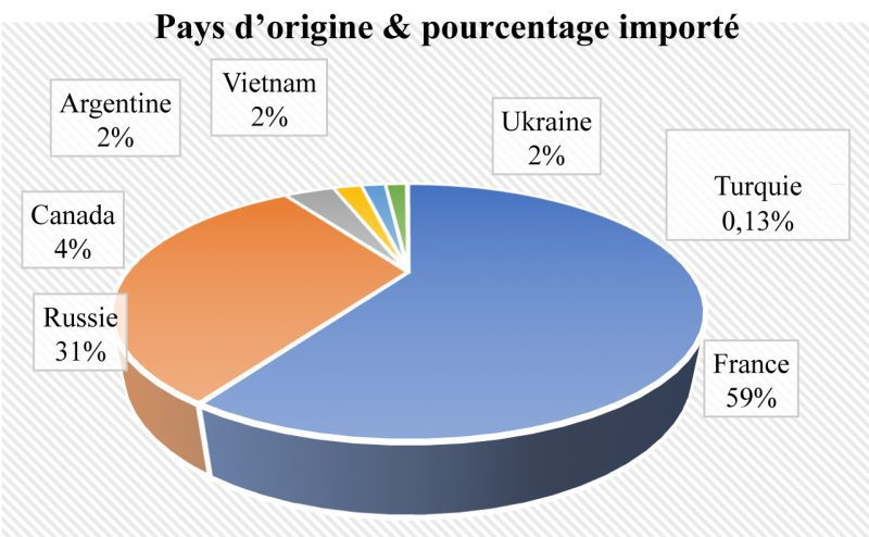 La cartographie des importations fait ressortir deux principaux pays d’origine que sont la France et la Russie, avec respectivement 112.399 tonnes, contre 59.850 tonnes. Les importations avec comme origine l’Ukraine sont marginales pour ce qui concerne le blé en 2021, avec seulement 3.000 tonnes.