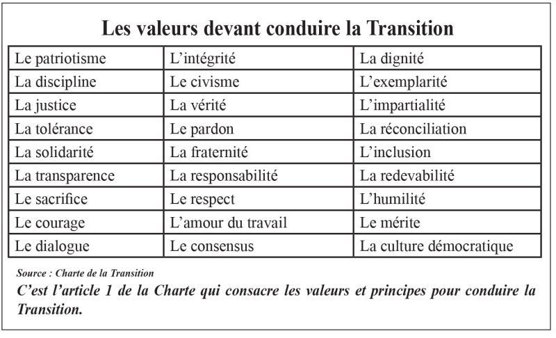 La Charte de la Transition a codifié un certain nombre de valeurs qui doivent guider les pas des autorités et des Burkinabè pendant et après cette Transition. Il s’agit de valeurs comme l’intégrité, l’exemplarité, le sacrifice, le mérite, le patriotisme, la transparence, l’amour du travail qui doivent être promues et valorisées au quotidien d’abord par les membres de l’Exécutif
