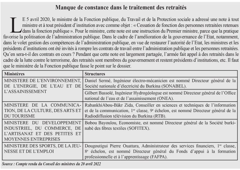Enfin, le ministère des Sports, de la Jeunesse et de l’Emploi a nommé un nouveau Directeur général pour le compte du Fonds d’appui à la formation professionnelle et à l’apprentissage (FAFPA). La procédure de nominations est aux antipodes de ce qui a été annoncé. Elles sont contraires à l’esprit de la Transition. Sur quels critères ces personnes ont été choisies, même si personne ne doute des compétences des promus? Ces nominations viennent allonger la liste des récriminations que les Burkinabè font aux autorités de la Transition à une période où au nom de la bonne gouvernance, des audits sont réalisés. Poser des actes contraires à ce qui est prescrit dans les documents officiels donne l’impression d’une gouvernance sans une bonne coordination. Les Burkinabè devraient encore patienter. Le recrutement des Directeurs généraux par appel à candidatures est renvoyé aux calendres grecques.