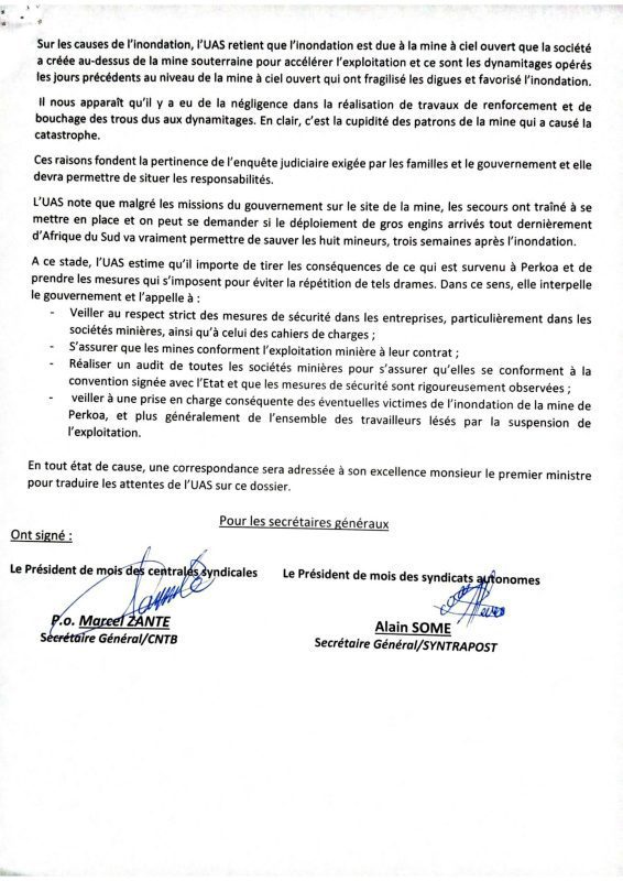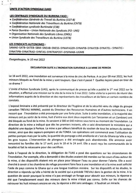 Ceci une déclaration de l’ unité d’action syndicale qui a rencontré la direction de la mine de Perkoa pour faire le point de l opération de sauvetage et comprendre le dispositif de sécurité mis en place par la mine avant l’inondation. De sa rencontre avec la direction, après autant de jour d’isolement, les chances de trouver des survivants s’amenuisent