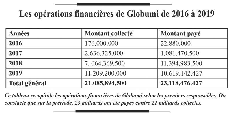 Au plan national, les investigations de l’expert auprès des banques ont permis de révéler un solde négatif pour Globumi, tandis que les comptes de ses deux responsables affichaient un solde positif mais dérisoire. La balance des différents comptes de Globumi et de ses deux responsables auprès de 6 banques de la place affiche un solde négatif de plus de 112 millions en août 2020. »