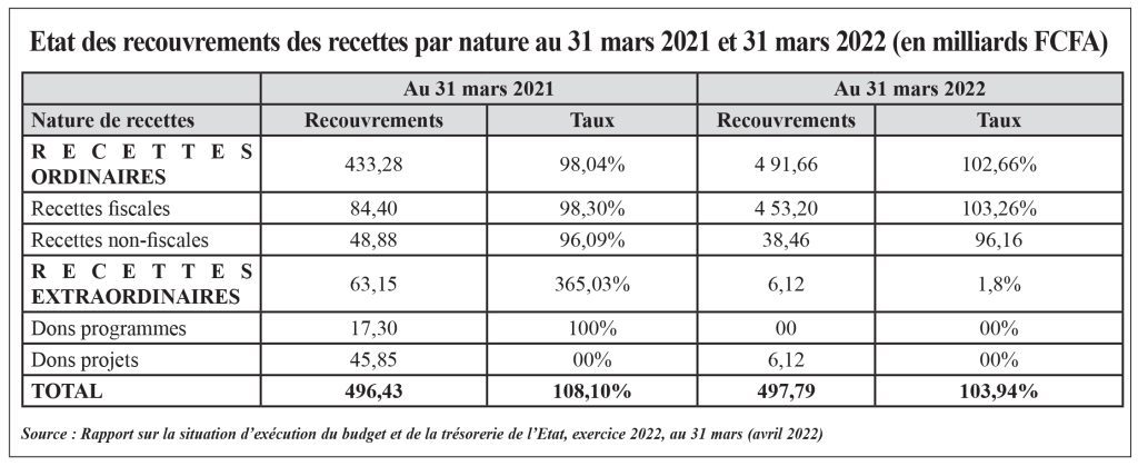 Les recettes ordinaires ont été recouvrées à hauteur de 491,66 milliards FCFA en fin mars 2022, soit un taux de 23,30%. Les recettes ordinaires représentent 98,77% du montant des recouvrements réalisés.