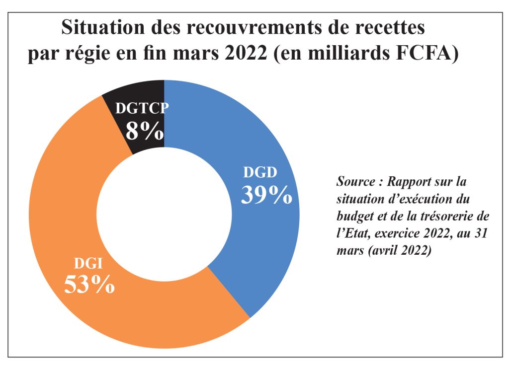 Les Impôts et la Douane en hausse, le Trésor en baisse Les structures chargées du recouvrement des recettes ordinaires sont la Direction générale des Impôts (DGI), la Direction générale des Douanes (DGD) et la Direction générale du Trésor et de la Comptabilité publique (DGTCP).