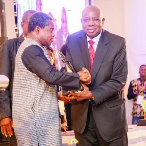 Le président du Conseil national du patronat burkinabè (CNPB), Apollinaire Compaoré, a remis un trophée spécial au Premier ministre, Albert Ouédraogo, à travers son représentant, son conseiller spécial, Pierre Nacoulma. (Ph. DR)