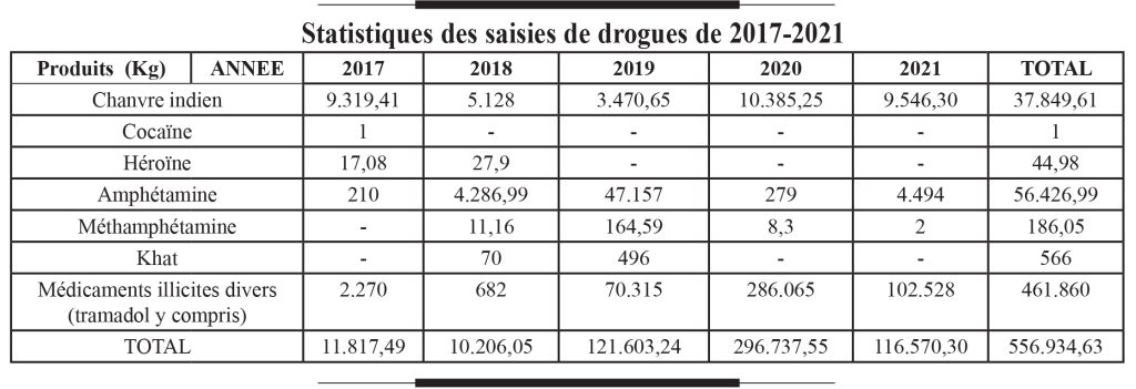 Les statistiques des saisies des 5 dernières années (2017-2021) montrent qu’en termes de volume, les médicaments prohibés viennent en première position (461.830 kg), suivis des amphétamines (56.426,99kg) et du chanvre indien ou cannabis (37.849,61kg). On y apprend aussi que hormis la saisie record de 115 kg opérée par la Brigade mobile de Bobo-Dioulasso le 19 mai 2022, il n’y a pas eu d’autre saisie de cocaïne ces trois dernières années. La dernière saisie du genre remonte à 2018 (27,9 kg d’héroïne saisi) et 2017 (17,08kg).