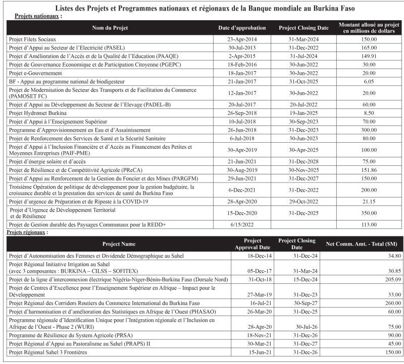 Malgré la situation politique qui a occasionné une pause d’un trimestre sur les décaissements, le Burkina Faso dispose de flux importants de ressources qui constituent des opportunités de relance de l’activité économique et de solutions aux différentes crises. En témoigne le portefeuille des opérations qui a pratiquement doublé en trois ans ; les engagements nets sont ainsi passés à 1,7 milliard de dollars américains en 2018 à plus de 3 milliards de dollars américains à ce jour. Mieux, depuis le réengagement, deux nouveaux projets viennent d’être approuvés par le Conseil d’administration de la Banque mondiale et avec ceux qui deviendront effectifs dans les prochains jours, le portefeuille de la Banque mondiale passera à 3,51 milliards de dollars américains, dont 2,51 milliards de la trésorerie disponible.
