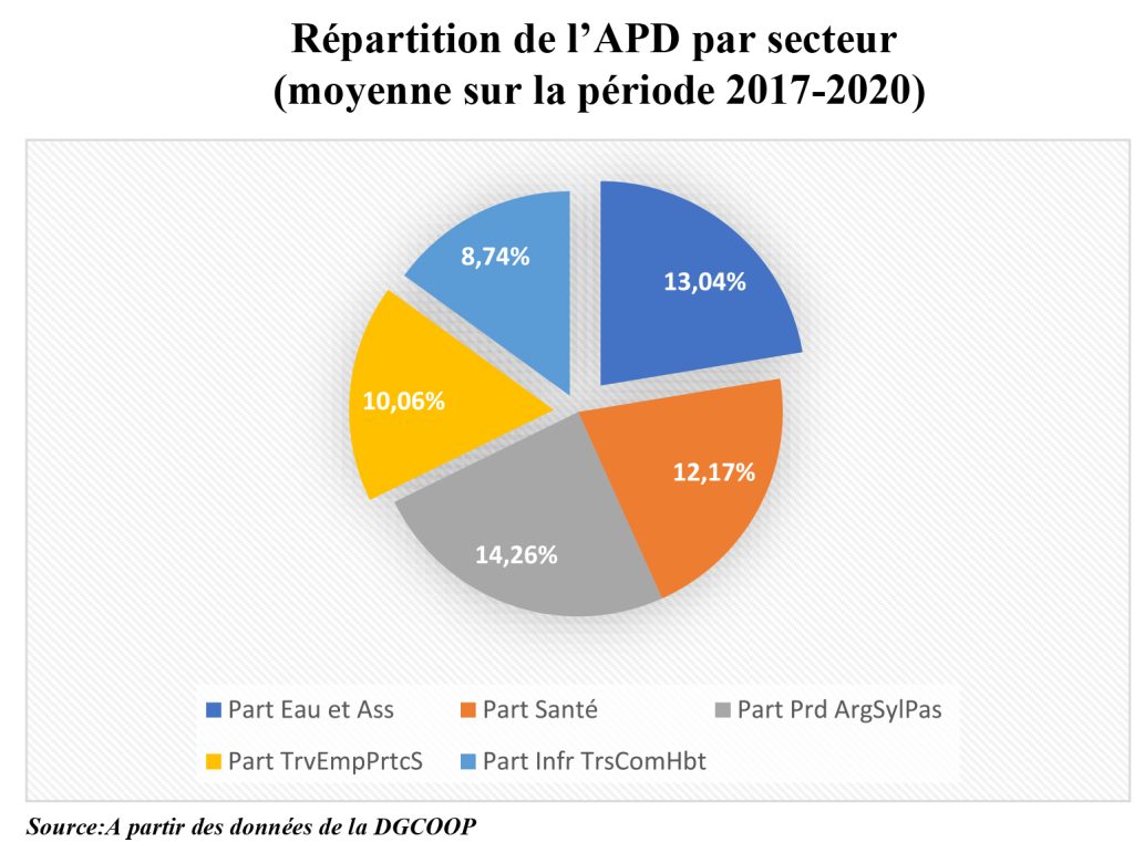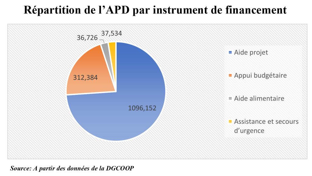 Dans la répartition de l’APD, il ressort une prédominance de l’aide projet. L’aide projet représente en moyenne 73,92% de l’APD sur la période 2016-2020, soit un montant annuel moyen de 1.096,152 millions de dollars US. Les appuis budgétaires (2e ) avec un montant annuel moyen de 312,387 millions de dollars, soit 21,07% de l’APD sur la période. Viennent ensuite, l’assistance et les secours d’urgence avec un volume annuel moyen de 37,534 millions de dollars US, soit en moyenne 2,53% de l’APD. Enfin, l’aide alimentaire avec un volume annuel moyen de 36,726 millions de dollars, soit une part moyenne de 2,48% de l’APD.