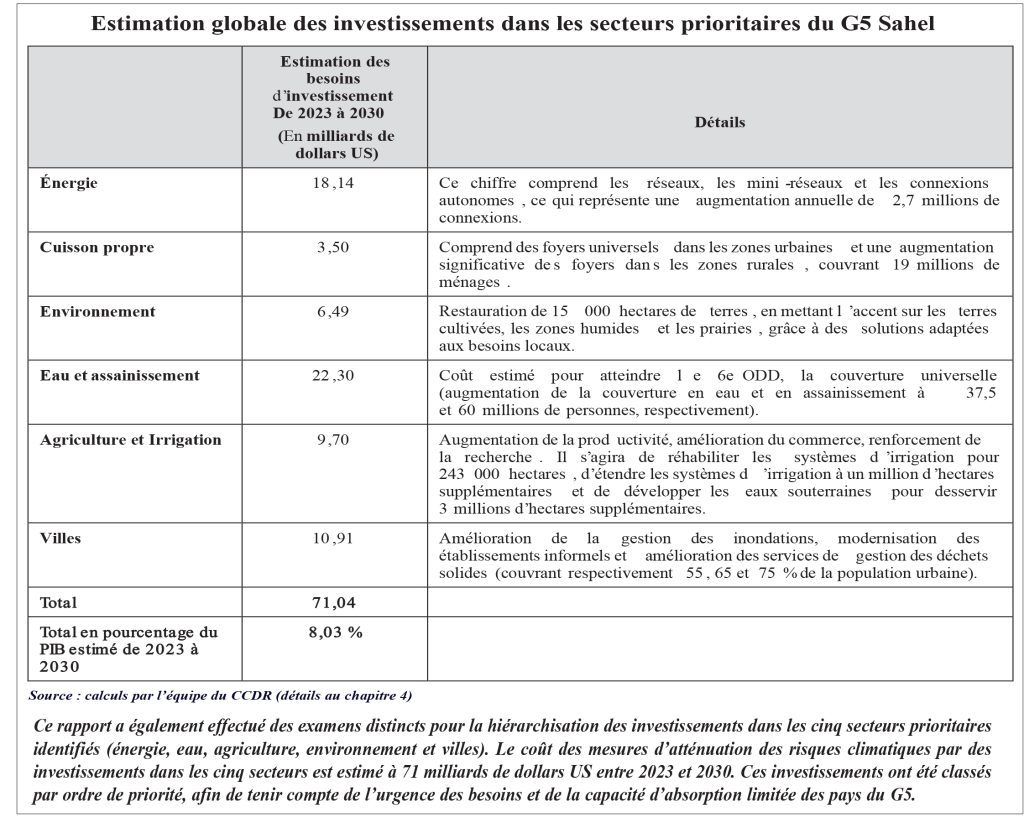 En somme, il a identifié trois axes prioritaires qui sont de grands défis des pays du G5 Sahel. Pour atténuer l’impact de cette crise et aider le secteur agricole à développer sa résilience climatique à moyen terme, il convient d’étendre les programmes de protection sociale et les initiatives en faveur des paysages agricoles pour adopter de meilleures pratiques de gestion des ressources et accroître l’usage des technologies adaptives, confère tableau sur l’estimation globale des investissements dans les secteurs prioritaires du G5 Sahel.