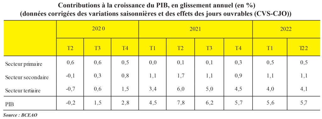 Comparativement aux prévisions communiquées en juin 2022, les perspectives de croissance de l’UEMOA ont été réduites en lien avec les performances moindres qu’attendu précédemment au Bénin. Globalement, la croissance économique au cours de la période 2022-2023 serait portée par le secteur tertiaire.