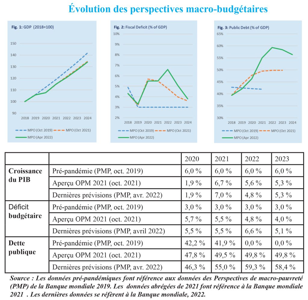 Le rapport révèle que le déficit budgétaire est beaucoup plus important en 2022 (6,6 % du PIB) que prévu précédemment par le MPO en octobre 2021, soit 4,8% du PIB (figure 2). La détérioration du déficit fait suite aux besoins de financement supplémentaires pour faire face à l’insécurité et aux pressions inflationnistes occasionnées par les chocs climatiques et le conflit en Ukraine. Dans l’ensemble, les dépenses déficitaires sont importantes depuis l’apparition de la pandémie et ce, dans un contexte de suspension du pacte de convergence de l’UEMOA depuis 2020.