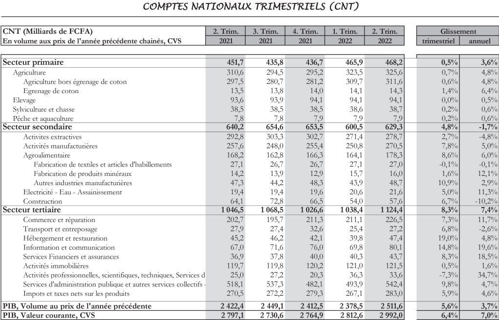 Forte hausse dans les activités du secteur tertiaire En épluchant les comptes nationaux, il ressort que la forte performance de l’économie est surtout imputable aux activités marchandes du secteur tertiaire. En effet, à l’exception des activités professionnelles, scientifiques, techniques et des services de soutien de bureau ayant baissé de 7,3%, les activités marchandes de ce secteur connaissent toutes des hausses mais dans des proportions très variées. Ainsi, on note de très fortes hausses dans les activités d’information et de communication (+14.8%) et dans les services d’hébergement et de restauration (+19%). Cette hausse de l’activité au deuxième trimestre est en partie imputable à la reprise du tourisme interne et d’une hausse des activités de restauration. Les activités immobilières enregistrent cependant une croissance timide de 0,5% de leur valeur ajoutée réelle. Dans les activités de commerce, le volume des ventes au deuxième trimestre a également augmenté (+7,3%). La hausse est aussi observée dans le volume des activités de transports et d’entreposage (+6,8%) et des services financiers et d’assurance (+8,3%). Le rythme des activités des administrations publiques s’accélère avec une croissance réelle de 9,8% au deuxième trimestre 2022. Les services non marchands des administrations publiques augmentent fortement de 9,8% au deuxième trimestre 2022. Cette hausse fait suite à une légère hausse de 2,5% déjà enregistrée au premier trimestre de l’année. L’accélération fait ainsi suite à une reprise des activités des administrations publiques, après un temps de latence dû par le changement de régime survenu au premier trimestre 2022.