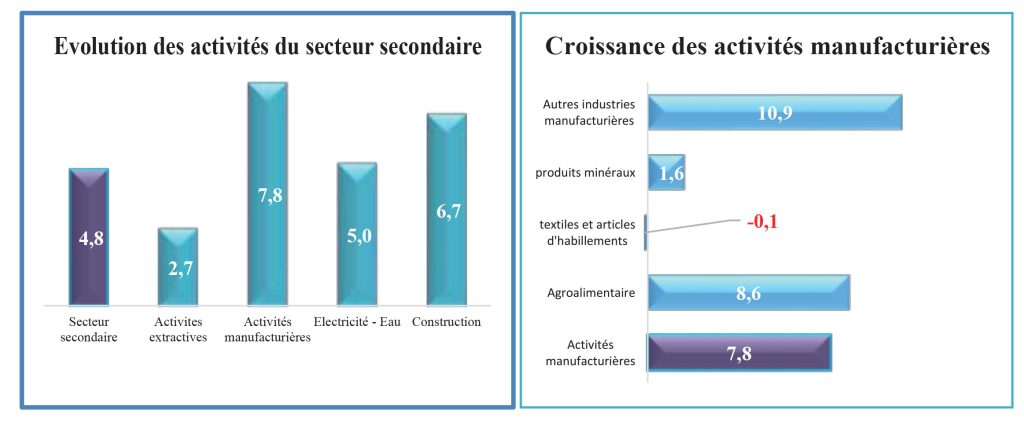 Dans le secteur secondaire, la croissance de 4,8% a été imprimée par toutes les branches d’activités avec des contributions positives. Les activités manufacturières connaissent la meilleure performance dans ce secteur d’activités. En effet, on enregistre une croissance de 7,8% du volume des activités de cette branche, suivie de la construction (+6,7%). Néanmoins, les activités extractives, représentant à elles seules la moitié de la valeur ajoutée du secondaire, ont connu une hausse timide de 2,7%, malgré deux baisses consécutives enregistrées sur les deux derniers trimestres (-0,2% au quatrième trimestre de 2021 et -10,3% au premier trimestre 2022). Cette timide reprise des activités extractives peut s’expliquer, d’une part, par la modeste hausse des quantités d’or produites, et d’autre part, par l’arrêt de la production du zinc. NK