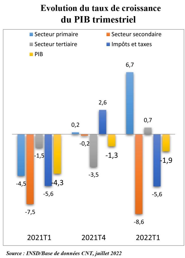 D’après le rapport, la persistance des attaques terroristes, l’avènement d’une transition politique (02 coups d’Etat en 8 mois) et une campagne agro-sylvo-pastorale jugée difficile vont impacter l’économie nationale. A ces facteurs endogènes s’ajoutent ceux exogènes tels que la crise russo-ukrainienne. Conséquence, l’activité économique 2022 connaîtrait une décélération de son rythme de croissance. C’est ainsi que les rapporteurs tablent que pour 2022, le taux de croissance de l’économie est projeté à 4,2%, contre 6,9% en 2021. Cette performance serait attribuable aux secteurs primaire (+9,5%) et tertiaire (+6,4%). Quant au secondaire, il connaitrait un repli (-2,2%). o