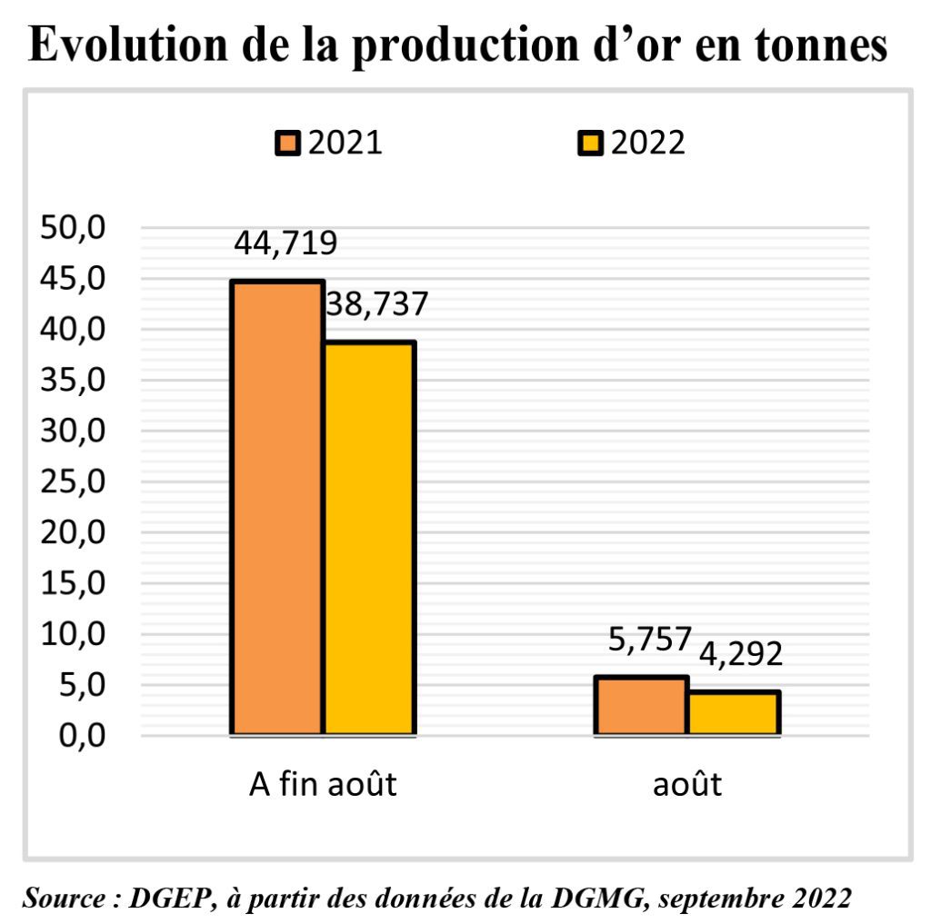 Il ressort que toutes les sociétés minières enregistrent une baisse de leur production, sauf Houndé, Essakane et Rox Gold. En août 2022, la production industrielle d’or fin s’élève à 4,292 tonnes, en hausse de 7,2% en rythme mensuel. Par rapport au même mois de l’année 2021, la production d’or est en baisse de 25,4%.
