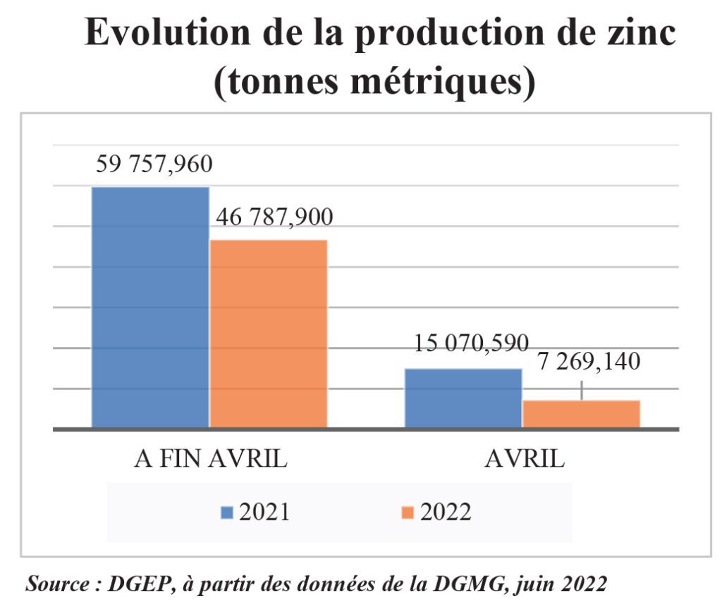 Le rapport souligne qu’en juin 2022, la production valorisable de zinc est nulle du fait de l’arrêt de l’activité, suite à l’inondation survenue dans la mine de Perkoa, en mi-avril 2022. Cet incident a entrainé une baisse de la production de 43,3% par rapport à celle de mars 2022. La production s’établit à 7 269,140 tonnes en avril 2022. Comparée à avril 2021, elle est en baisse de 51,8%. A fin avril 2022, la production totale de zinc ressort à 46 787,900 tonnes, en baisse de 21,7% par rapport à fin avril 2021.