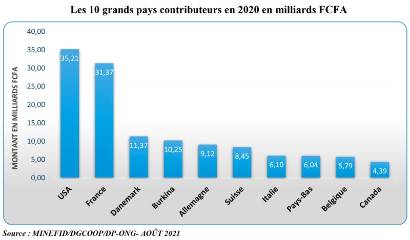 Parmi les 10 plus grands pays contributeurs au titre de l’année 2020, les USA occupent la première place, avec une contribution totale de 35,21 milliards FCFA, suivis de la France avec 31,37 milliards FCFA. Le Danemark occupe la troisième place avec 11,37 milliards FCFA, suivi du Burkina Faso avec un montant de 10,25 milliards FCFA. La contribution des autres pays varie entre 4,39 milliards FCFA et 9,12 milliards FCFA.