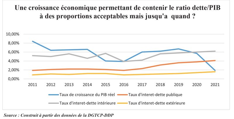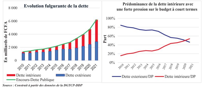 Le rapport souligne que l’encours de la dette publique est passé de 1. 324,41milliards FCFA en fin 2010 à 6. 212,25 milliards FCFA en 2021, soit une progression en moyenne annuelle de 15,26%. Autre précision de taille, le pays s’endette plus avec les bailleurs internes. A titre d’exemple, la dette intérieure connaît un accroissement annuel moyen de 29,24%.
