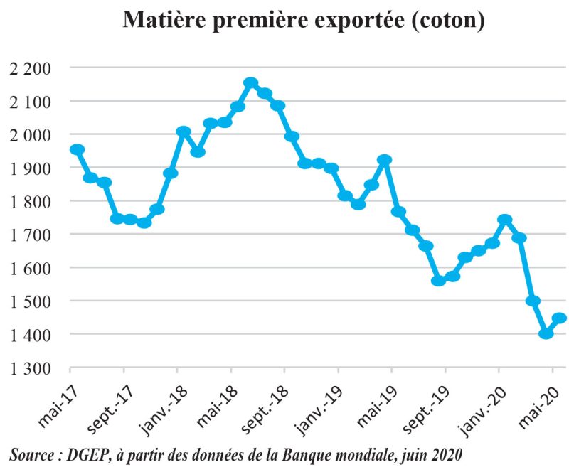 Concernant les principales matières premières exportées, le cours mondial de l’once d’or enregistre en mai 2020, une hausse de 2,1%. En effet, il s’est affiché à 1715,7 dollars US contre 1 680,0 dollars US en avril 2020. Quant au cours du coton, en mai 2020, il a enregistré une hausse de 3,4% en se situant à dollars US contre 1 400,6dollars US en avril 2020. En particulier, pour le pétrole, produit importé, le cours du baril a enregistré une hausse de 33,0% en mai 2020, en se situant à 31,0 dollars US contre 23,3 dollars US un mois plus tôt. La reprise du cours du baril serait liée à la relance des activités suite aux mesures d’allègement progressif du confinement des populations à travers le monde en début mai 2020. Par rapport à mai 2019, le cours du baril est en baisse de 56,0%.