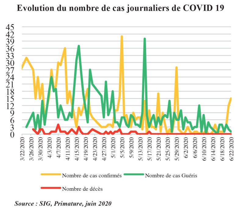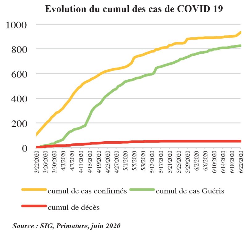 A fin mai 2020, la situation sanitaire fait état de 884 cas confirmés positifs au Coronavirus. Parmi ces cas, 751 guérisons ont été enregistrées contre 53 décès. A la date du 22 juin, il est enregistré au total 934 cas positifs, dont 826 guérisons et 53 décès, soit environ 88,4% de taux de guérison et 5,7% de létalité.