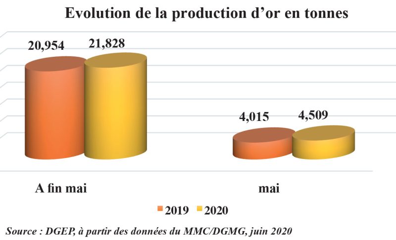 Dans le secteur des mines, en mai 2020, la production totale d’or industrielle est évaluée à 4,509 tonnes contre 4,365 tonnes le mois précédent, soit une hausse de 3,3%. Cette production est en hausse de 12,3% par rapport au même mois de l’année passée. A fin mai 2020, la production totale d’or fin est ressortie à 21,828 tonnes, en hausse de 4,2% en glissement annuel.
