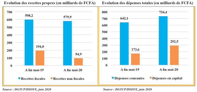 Au niveau des finances publiques, à fin avril 2020, les recettes propres du budget de l’Etat ont été mobilisées à hauteur de 674,8 milliards FCFA contre 792,2 milliards FCFA à la même période en 2019, soit une baisse de 14,8%. Quant aux dépenses totales du budget de l’Etat, elles ont été effectuées à hauteur de 1026,9 milliards FCFA contre 815,6 milliards FCFA à la même période en 2019, soit une hausse de 25,9%.