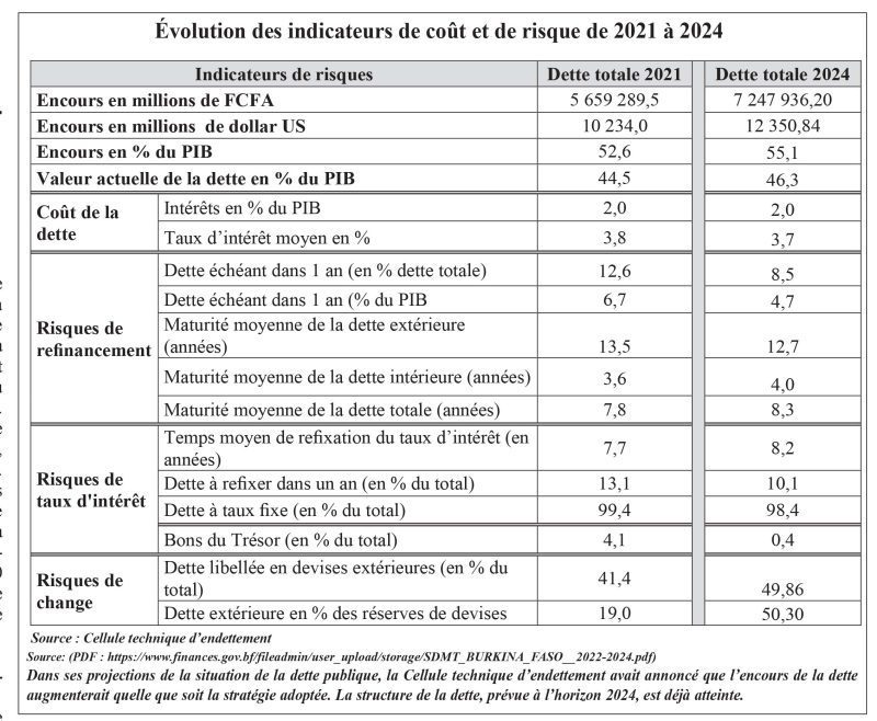 En ce qui concerne les emprunts obligataires, le Burkina Faso utilise principalement deux instruments, à savoir : les Bons assimilables du Trésor (BAT) et les Obligations assimilables du Trésor (OAT). Le service de ces dettes (montants à payer par l’emprunteur) lui aussi connait une hausse. De 389,1 milliards FCFA en 2020, il est passé à 620,2 en 2021. Et pour les 3 premiers trimestres de 2022, le service de la dette était de 581 milliards FCFA.