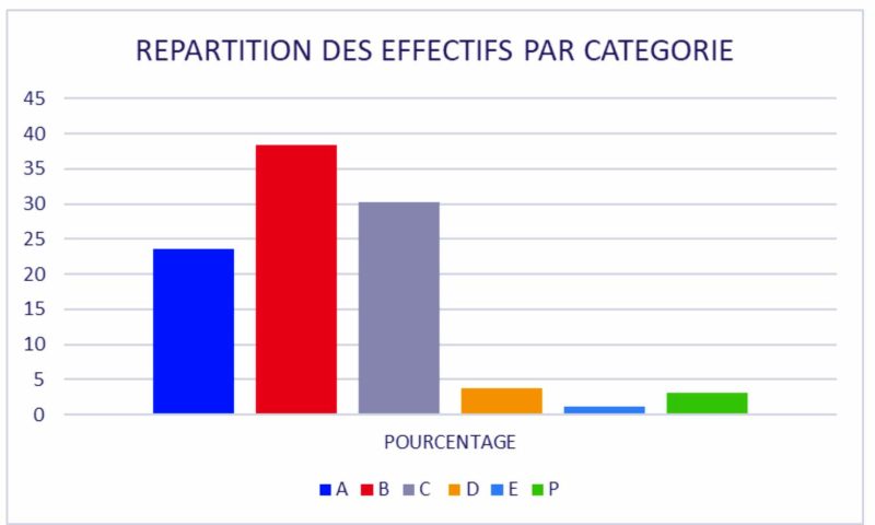 La catégorie la plus représentative au sein de l’administration publique est la catégorie B. Les agents de cette catégorie (85.865) représentent plus de 38% de l’effectif global. Elle est suivie par la catégorie C (30%) et la catégorie A (23,6%).