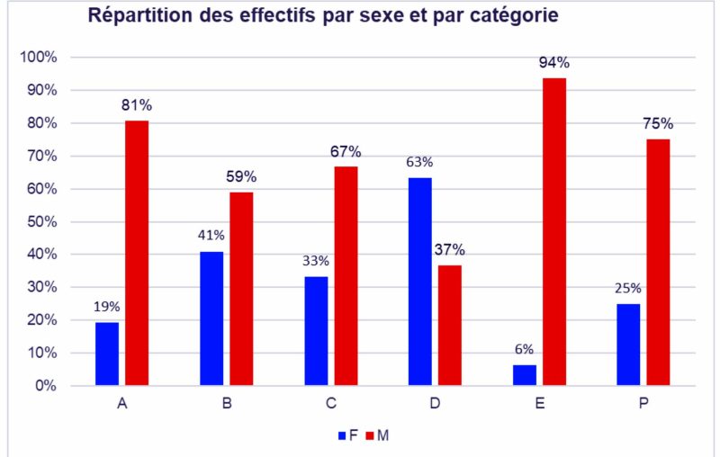 Au-dessus de la catégorie A, il y a la catégorie P qui compte 75% d’hommes, contre 25% de femmes. Soit une femme pour 5 hommes pour le poste de décideur.