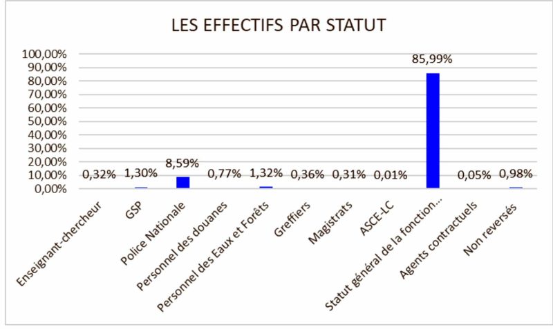 Sur les 223.853 fonctionnaires, ceux du ministère de la Fonction publique étant les plus nombreux, avec 192.481 agents, suivi du statut du personnel du cadre de la Police nationale avec 19.228 agents, soit 8,59% de l’effectif total des agents.
