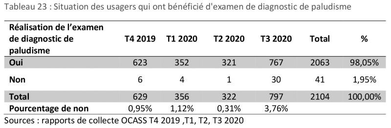 La veille citoyenne a ainsi analysé la disponibilité des services et prestations. Il ressort ainsi du document que 98,05% des usagers ont bénéficié d’un examen de diagnostic du paludisme lors de leur visite dans le centre de santé contre 1,95% qui ont déclaré n’avoir pas bénéficié. Les patients qui n’ont pas bénéficié de test de diagnostic ont été beaucoup rencontrés au cours du 3e trimestre 2020, où 3,76% des usagers sont concernés.