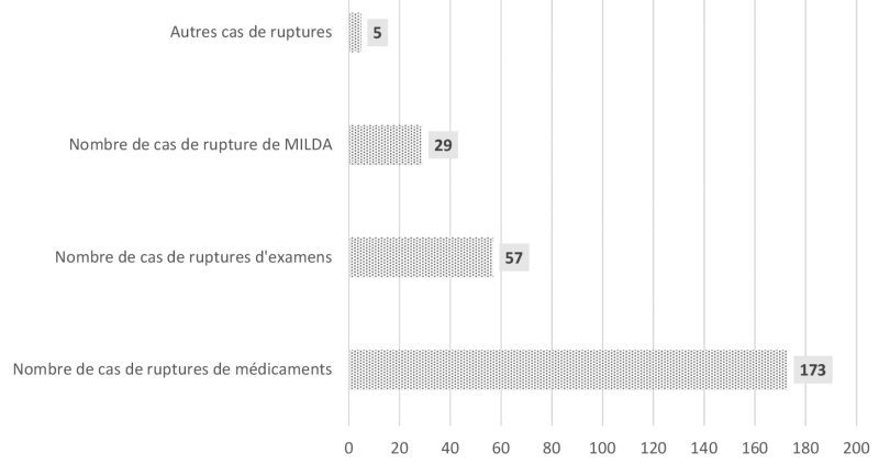 Ainsi, au cours de la période, 173 cas de ruptures de médicaments, 57 cas de ruptures d’examens de diagnostic et 29 cas de ruptures de MILDA de routine ont été rapportés par les acteurs dans les formations sanitaires. Au regard des chiffres, 65,53% ruptures concernent les médicaments. Ce qui constitue le premier problème auquel les malades du paludisme ont été confrontés sur ces 4 périodes. Elles sont suivies par les ruptures d’examens, 21,59%. Les molécules qui ont été fréquemment en rupture sont les ATC adultes (1re ligne), la quinine injectable/Artésunate injectable (2e ligne), ’ACT/Arthemeter+luméfantrine enfants (1re ligne), la quinine 300 mg (2e ligne), les médicaments de la prophylaxie antipaludique chez les femmes enceintes.