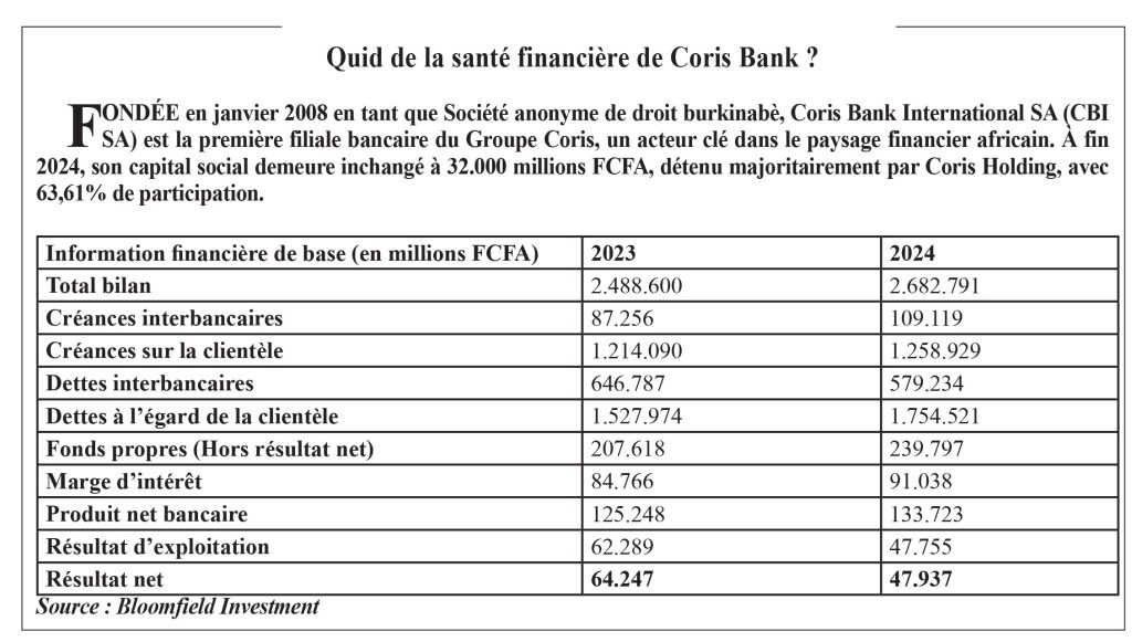 Sur le plan opérationnel, selon les statistiques de Bloomfield Investment, Coris affiche des résultats nuancés. La marge d’intérêt s’accroît, passant de 84,8 milliards à 91 milliards FCFA, et le produit net bancaire progresse de 125,2 à 133,7 milliards FCFA. Toutefois, le résultat d’exploitation recule sensiblement, de 62,3 milliards à 47,8 milliards FCFA. Le résultat net suit la même tendance, chutant de 64,2 milliards en 2023 à 47,9 milliards en 2024. Cette contraction peut résulter en grande partie de la hausse du coût du risque liée à la progression des créances en souffrance, un enjeu récurrent pour les banques opérant dans un contexte économique tendu. La stabilité des taux directeurs de la BCEAO, qui renchérit le coût des ressources interbancaires, accentue également la pression sur les marges.