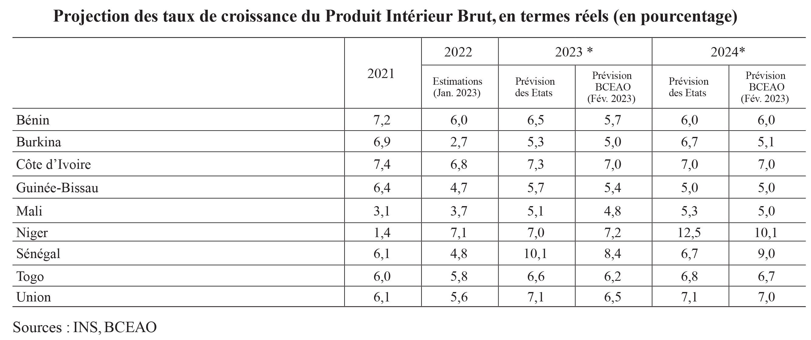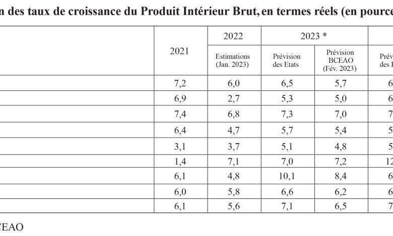 Selon le document que L’Economiste du Faso a pu consulter, les projections macroéconomiques dans l’Union demeurent globalement favorables, malgré la persistance de certains facteurs de risques baissiers. Pour l’année 2023, les projections de la Banque centrale tablent sur une augmentation de 6,5% du PIB de l’Union, en termes réels. L’activité économique serait portée par les secteurs tertiaire et secondaire. L’accroissement des productions extractives, consécutif, notamment, au démarrage vers la fin de l’année de la production pétrolière et gazière au Sénégal, devrait soutenir la dynamique du secteur secondaire. La consolidation des activités commerciales et des services, ainsi que l’augmentation de la production agricole, en raison de la poursuite de la mise en œuvre, dans la plupart des pays, de programmes visant à améliorer les rendements des principales spéculations et des produits vivriers seraient bénéfiques pour la croissance.