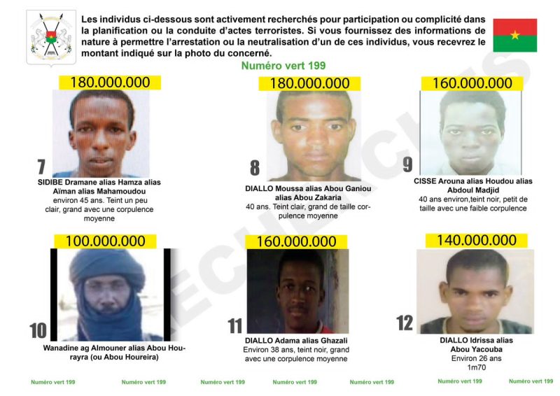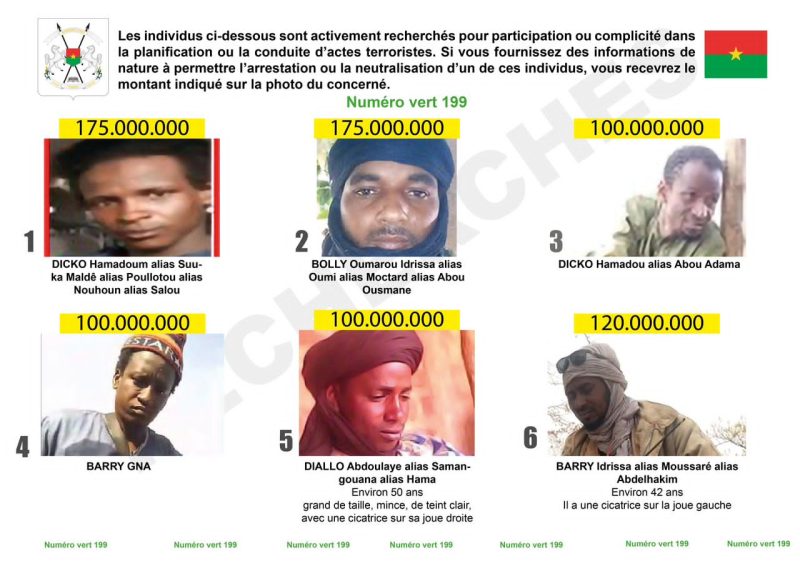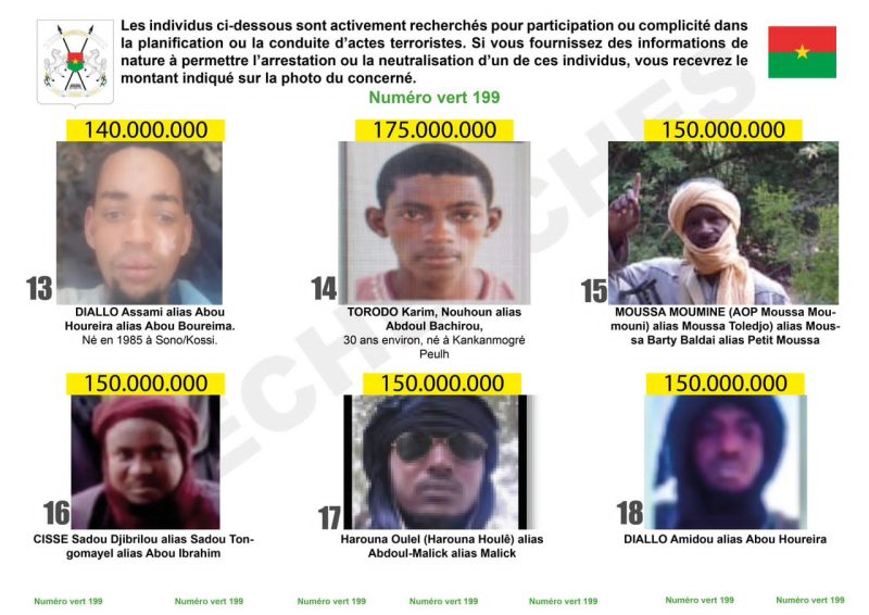 Egalement sur cette liste, le Burkina recherche Dicko Hamadoun alias « Suu-ka Maldê » et Bolly Oumarou alias « Oumi ». La prime pour des informations permettant de les capturer sont de 175 millions F CFA chacun.