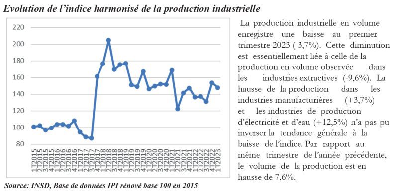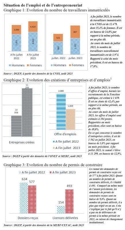 Ainsi, pour le mois d’août, on retient que la production totale d’or est de 31,786 tonnes à fin juillet 2023, en baisse de 7,7% par rapport à la même période, un an plus tôt. Les offres d’emploi, hormis les recrutements de la Fonction publique, sont estimées à 1.659, en chute de 42,4% par rapport à la même période, un an plus tôt. S’agissant des travailleurs nouvellement immatriculés à la CNSS, ils sont au nombre de 12.479, en hausse de 14% par rapport à la même période, un an plus tôt. Quant au nombre d’entreprises créées, il s’élève à 11.299, en hausse de 12,9% sur un an.