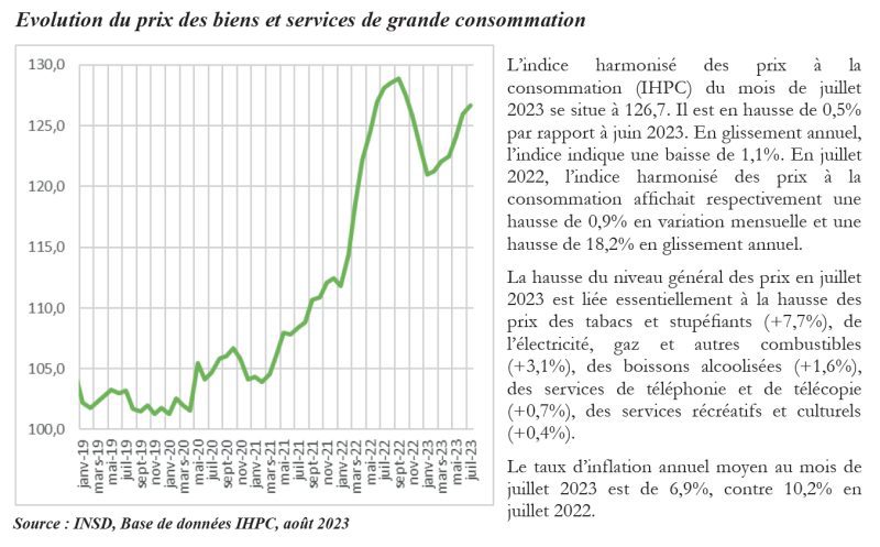 En juillet 2023, le service de la dette est évalué à 13,7 milliards de francs CFA, contre un montant de 100,0 milliards de francs CFA décaissé en juin 2023.