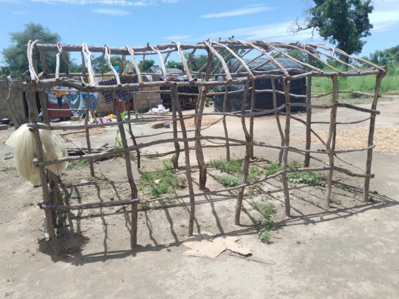 Fatimata, ses filles et ses petits enfants vivent sur un terrain d’environ deux hectares. Sur un espace délimité d’environ 100 m2, 4 habitats spontanés dont la superficie varie de 6 à 9 m2 ont été érigés pour accueillir la maisonnée. L’armature en cerceau est faite de branche d’arbres, des feuilles bouchent les espaces entre les branches et des bâches en plastique de couleur noire viennent protéger le tout contre l’infiltration de l’eau pluviale.