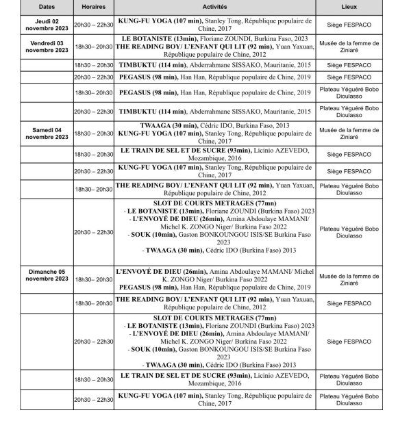 L’ouverture officielle se déroulera le jeudi 02 novembre 2023 à partir de 18 h au siège du FESPACO. Il est prévu pour l’occasion des séances de projection de 3 films chinois parmi lesquels il y a film intitulé « Kung-Fu Yoga », avec le célèbre acteur chinois Jackie Chan. Ces films vont permettre à la population de découvrir les modes de vie de cet État d’Asie qui est l’une des plus grandes puissances économiques du monde. 06 films africains, dont « Le Botaniste » de la réalisatrice burkinabè Floriane Zoundi et Timbiktu du Mauritanien Abderramane Sissako seront projetés. Les projections des films se feront à Ouagadougou au siège du FESPACO, à Bobo Dioulasso au plateau Yéguéré et à Ziniaré au Musée de la Femme. Le public n’aura pas à débourser de l’argent pour avoir accès à ces séances de projections.