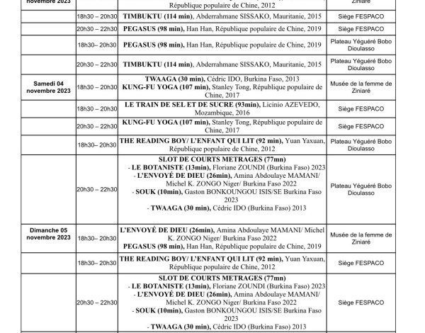 L’ouverture officielle se déroulera le jeudi 02 novembre 2023 à partir de 18 h au siège du FESPACO. Il est prévu pour l’occasion des séances de projection de 3 films chinois parmi lesquels il y a film intitulé « Kung-Fu Yoga », avec le célèbre acteur chinois Jackie Chan. Ces films vont permettre à la population de découvrir les modes de vie de cet État d’Asie qui est l’une des plus grandes puissances économiques du monde. 06 films africains, dont « Le Botaniste » de la réalisatrice burkinabè Floriane Zoundi et Timbiktu du Mauritanien Abderramane Sissako seront projetés. Les projections des films se feront à Ouagadougou au siège du FESPACO, à Bobo Dioulasso au plateau Yéguéré et à Ziniaré au Musée de la Femme. Le public n’aura pas à débourser de l’argent pour avoir accès à ces séances de projections.