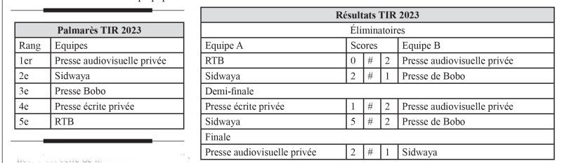 Au total, cinq équipes ont pris part à cette compétition. Il s’agit de la presse écrite privée (papier et en ligne), la presse audiovisuelle privée, la RTB (radio et télévision), la presse de Bobo-Dioulasso et les Editions Sidwaya. Déroulé sous le format de mini-championnat, le TIR 2023 a connu trois étapes, à savoir les quarts de finales, les demies finales et la finale.